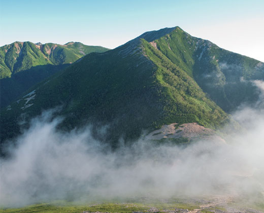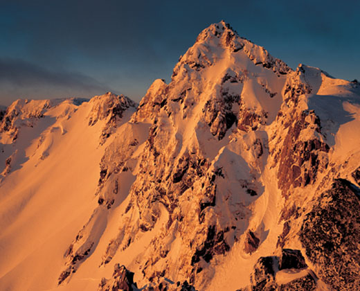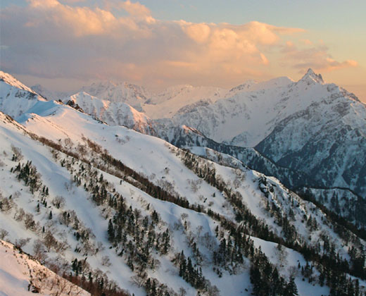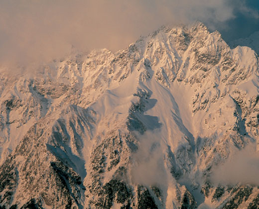 雪煙と雲まとう岩峰