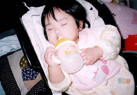 ミルクを飲んでいる途中で力つきた『まにゃ』。(29K)